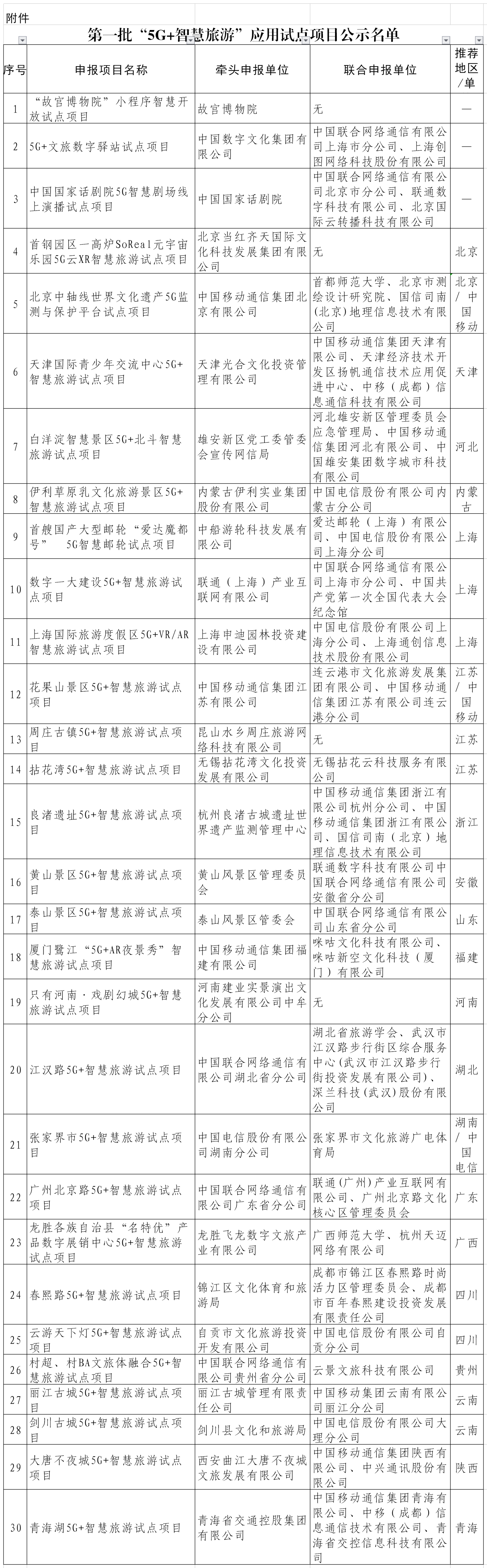 据文化和旅游部讯息,凭证《文化和旅游部办公厅 工业和信息化部办公厅对于组织开展“5G+灵敏旅游”行使试点形貌陈述职责的奉告》(办资源发〔2023〕145号),在有关部门推选和企处事单元自觉陈述的基础上,经大家评审,文化和旅游部、工业和信息化部拟确定第一批“5G+灵敏旅游”行使试点形貌,共30个形貌入选。 现将第一批“5G+灵敏旅游”行使试点形貌赐与公示,公示期为5天,笃定如下。(记者 秦立玲)
